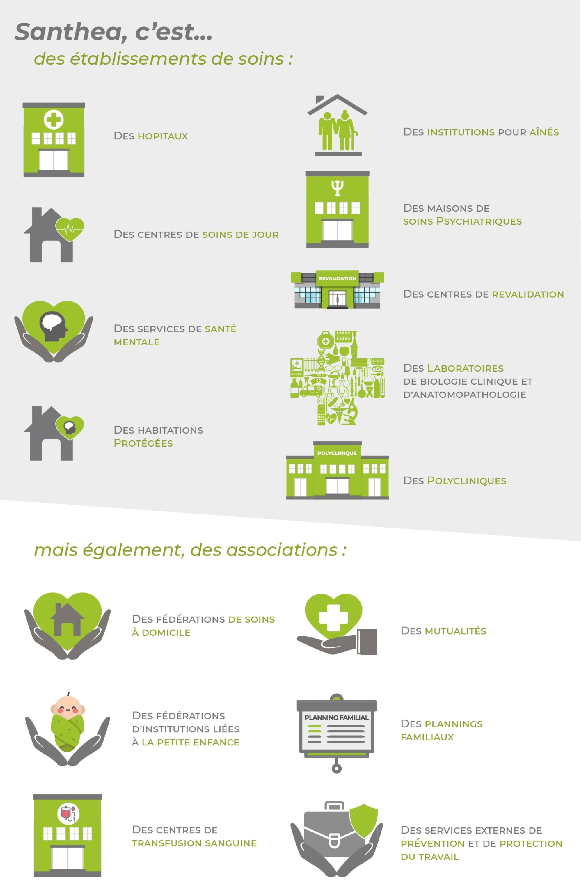 Santhea représente, en Région wallonne et Région bruxelloise, des hôpitaux (plus de 50% des lits hospitaliers wallons) ainsi que d’autres établissements de soins tels que les maisons de repos (et de soins), les centres de soins de jour, les résidences - services, les maisons de soins psychiatriques, les services de santé mentale, les centres de revalidation, les initiatives d’habitation protégée, les laboratoires de biologie clinique et d'anatomopathologie et les polycliniques. Santhea représente également des organisations comme les fédérations de soins à domicile, les mutualités, les fédérations d’institutions liées à la petite enfance, les plannings familiaux, les centres de transfusion sanguine ou encore les services externes de prévention et de protection au travail.